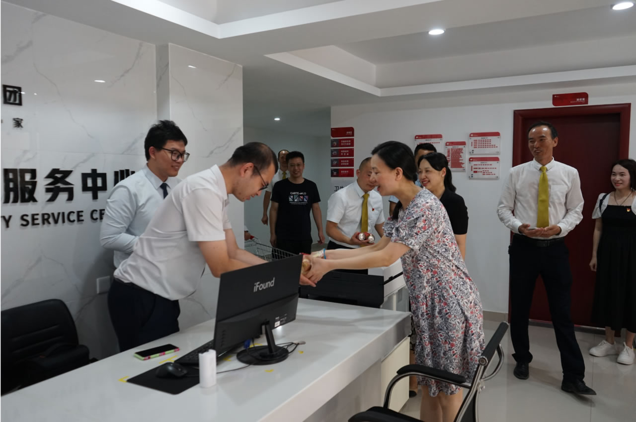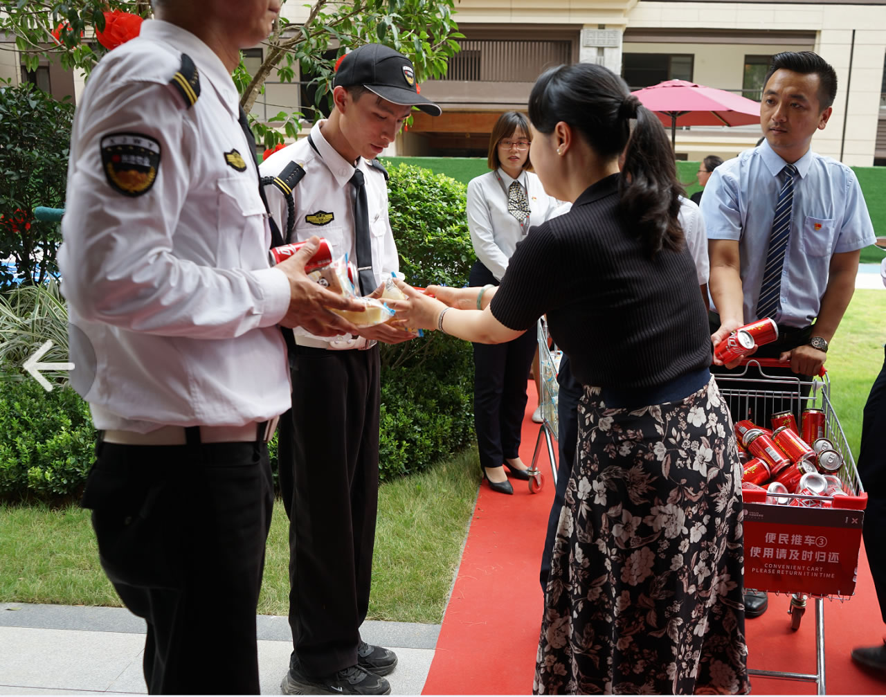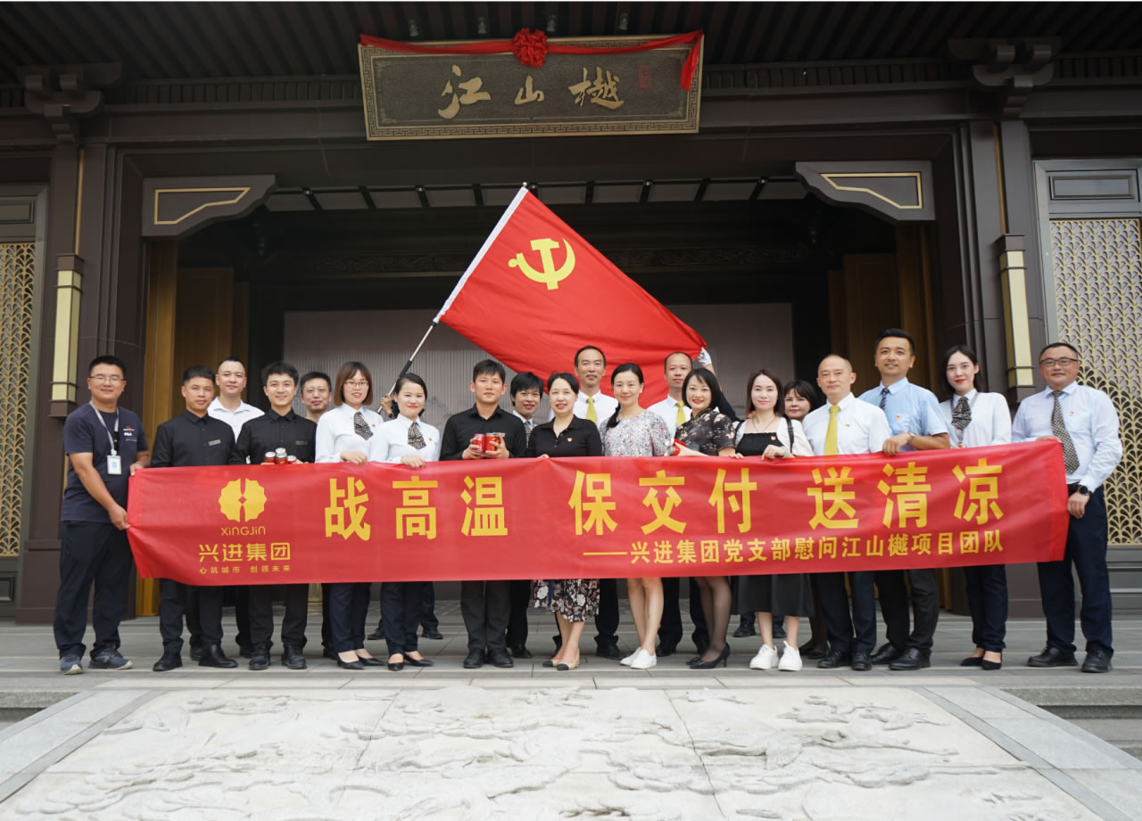 人生就是博集团党支部书记罗捷、集团副总裁王敏、人生就是博物业效劳集团总司理王永忠、集团党支部宣传委员陈健向导党员代表一行,,,,,为奋战在交付一线的项目、物业、营销员工以及集团交房支援职员送去解暑清凉慰问品,,,,,让坚守在岗位的一线员工们感受到丝丝清凉和浓浓眷注。。。